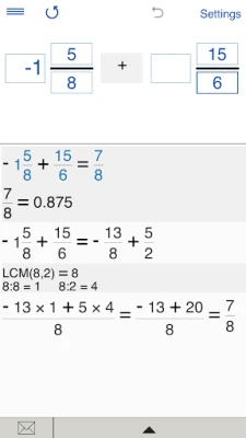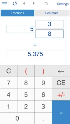 - To convert a fraction to a decimal number, tap ‘Fractions', input a fraction or a mixed number and tap "=".