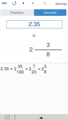 - To convert a decimal number to a fraction, tap ‘Decimals’, enter a decimal number using the decimal point "." as separator (eg. 1.23) and tap "=".