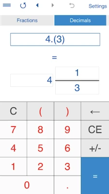 - To convert a fraction to a decimal number, tap ‘Fractions', input a fraction or a mixed number and tap "=".